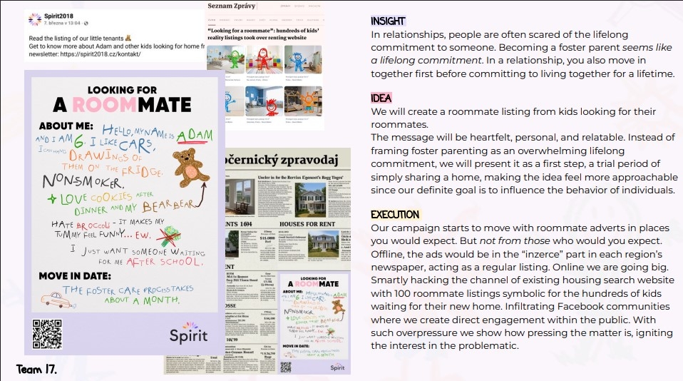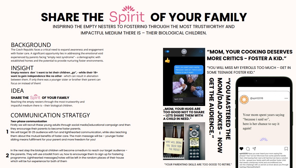 Soutěžící měli navrhnout kampaň, která osloví veřejnost a motivuje 1000 nových rodin k pěstounství. Kampaň měla zvýšit povědomí o pěstounské péči, získat 100 tisíc pravidelných sledujících a přivést 1500 vážných zájemců do pěstounského klubu. Návrh je připravován pro organizaci Spirit, která podporuje pěstounství a usiluje o to, aby žádné dítě nemuselo vyrůstat v ústavu.