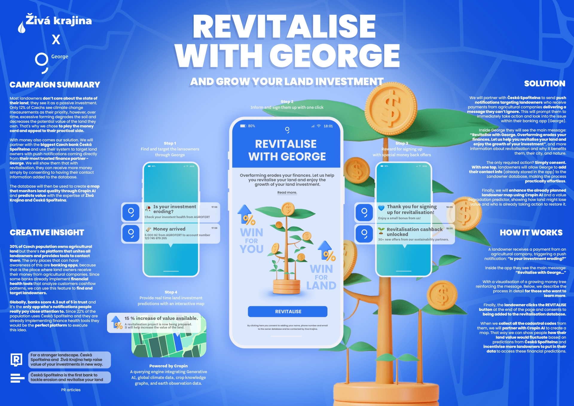 Soutěžící měli navrhnout digitální kampaň, která motivuje vlastníky zemědělské půdy k aktivní péči o půdu a také k obnově krajiny, aniž by se museli obávat složité byrokracie. Kampaň měla zajistit sběr kontaktů na vlastníky půdy, změnit vnímání vlastnictví zemědělské půdy jako pasivního aktiva a vytvořit komunitu zapojených vlastníků. Návrh je určen pro neziskovou organizaci Živá krajina, která propojuje vlastníky půdy s obcemi usilujícími o udržitelná adaptační opatření.