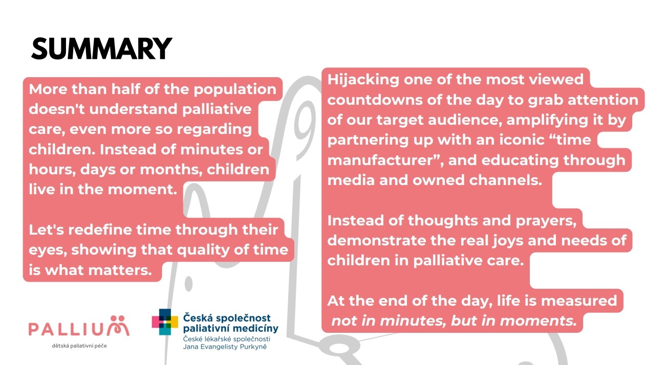 Soutěžící měli navrhnout PR kampaň, která pomůže překonat tabu spojená s dětskou paliativní péčí a zvýší povědomí o její komplexnosti. Kampaň měla oslovit širokou veřejnost, novináře, tvůrce obsahu i politiky a upozornit na nutnost dostupné a variabilní péče napříč regiony ČR. Návrh je připravován pro organizace Česká společnost paliativní medicíny a Pallium.