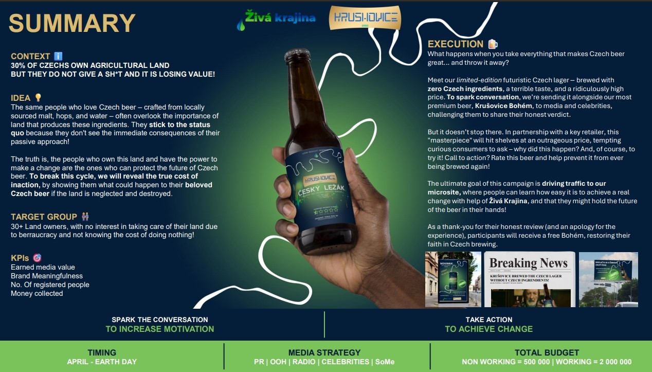 Soutěžící měli vytvořit marketingovou kampaň, která motivuje vlastníky zemědělské půdy k zapojení do projektu na opatření obnovy krajiny. Kampaň měla efektivně oslovit dvě hlavní cílové skupiny – starší generaci vlastníků vnímajících půdu jako rodinné dědictví a mladší generaci rozhodující se na základě investičního potenciálu – a vést je k jednoduchému kroku: vyplnění online formuláře. Návrh je určen pro iniciativu Živá krajina.