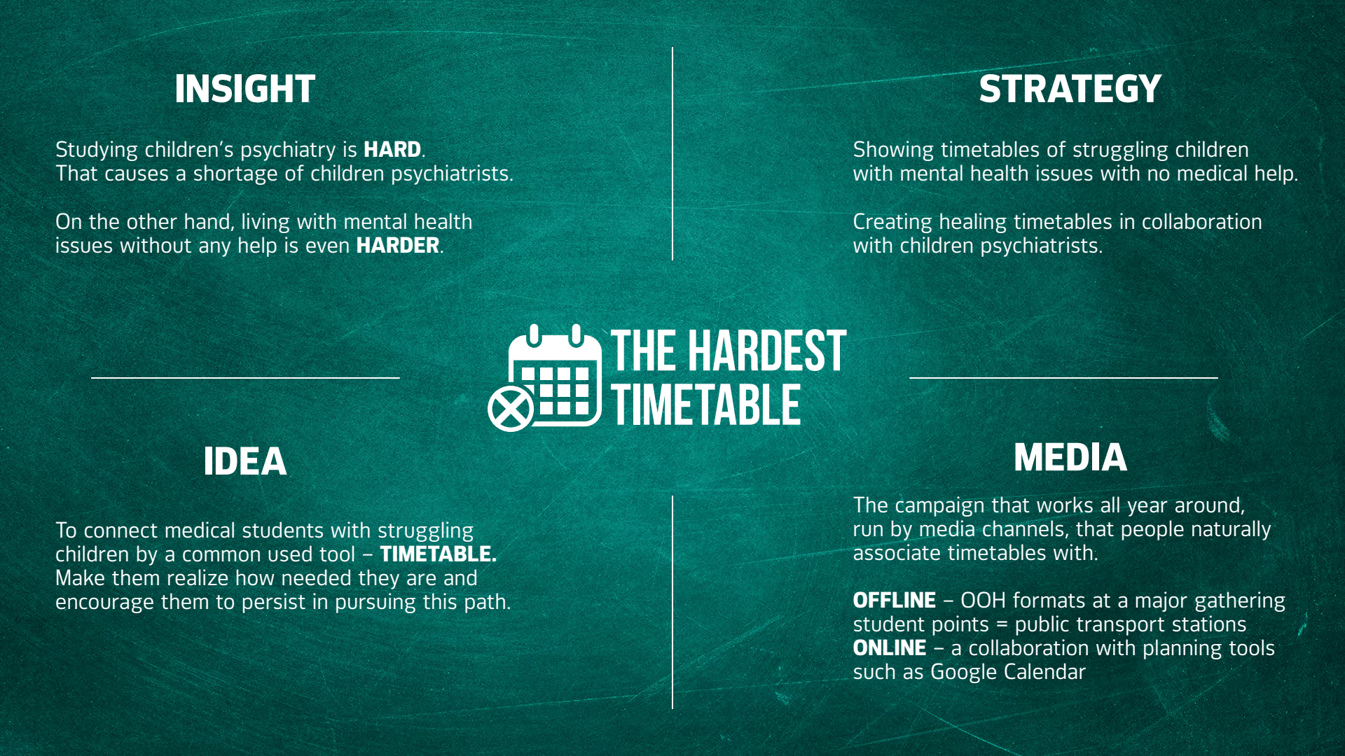 Vítězem kategorie média se stala dvojice Judita Růžičková a David Červený z agentury Zaraguza. Stejná dvojice zvítězila i v loňském roce. Úkolem soutěžících bylo během 24 hodin navrhnout komunikaci pro nadaci Kapka Naděje s cílem přilákat novou generaci dětských psychologů a zviditelnit téma rostoucích problémů duševního zdraví dětí a dospívajících.