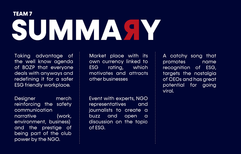 Úkolem soutěžících bylo uvést udržitelnou transformaci a dobrovolný ESG reporting pro malé a střední firmy tak, aby aktivitu chápaly jako příležitost pro svůj dlouhodobý růst. Strategii vytvářeli pro organizaci Změna k lepšímu.
