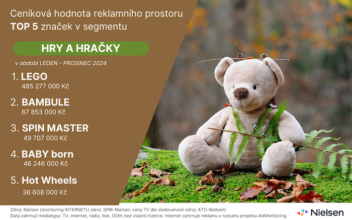 V loňském roce v segmentu her a hraček nejvíce inzerovala značka Lego, podle ceníkových cen investovala do reklamy přes 485 milionů korun. S velkým odstupem za ní se pak na dalších příčkách umístily Bambule a Spin Master. Vyplývá to z monitoringu reklamy Ad Intel výzkumné agentury Nielsen.