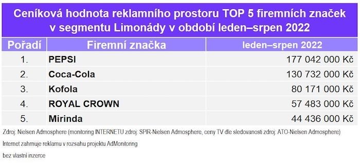 Inzerentem číslo jedna v segmentu limonád je v letošním roce zatím značka Pepsi. Do reklamy podle monitoringu společnosti Nielsen Admosphere investovala přes 177 milionů korun v ceníkových cenách. Za ní se umístila Coca-Cola s reklamou za necelých 131 milionů korun a Kofola za více než 80 milionů korun.