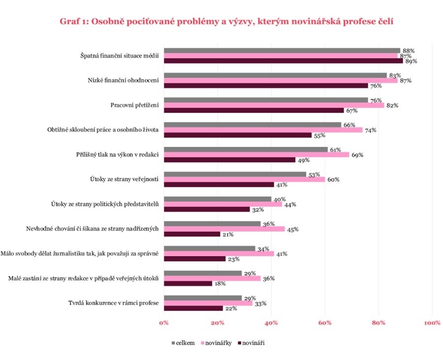 Nejzávažnějším pociťovaným problémem české žurnalistiky je z pohledu novinářů a novinářek špatná finanční situace médií (dle 88 % dotazovaných) a s tím související nízké finanční ohodnocení (83 %) a pracovní přetížení (76 %). Dalším problémem je pak nestabilita pracovního postavení. Téměř čtvrtina (24 %) novinářů a novinářek pracuje jako osoba samostatně výdělečně činná (OSVČ). Pokud by si však mohli vybrat, přibližně dvě třetiny z nich (67 %) by přitom upřednostnili pracovní poměr. Relativně vysoký podíl respondentů aktuálně zvažuje odchod z redakce (31 %) nebo dokonce odchod ze žurnalistiky jako takové (28 %). „Odchod významně častěji zvažují ženy, nejmladší generace novinářů a novinářek do 40 let a ti na řadových pozicích. To lze číst jako jasný signál, kterým skupinám podmínky v českých redakcích příliš nevyhovují,” podotýká Urbániková.