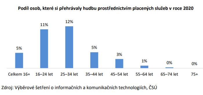 Podle dat ČSÚ platilo v roce 2020 za poslech či stažení hudebních nahrávek přes internet zhruba 5 % osob starších 16 let. Jejich podíl se oproti roku 2019 zvýšil přibližně o 2 procentní body. Nejvíce tyto služby (např. Spotify či iTunes) využívají mladší lidé mezi 16 a 34 lety a podíl osob platících za poslech hudby přes internet v této kategorii přesahuje desetiprocentní hranici. Ve věkové kategorii 16 a 24 let se pak podíl osob poslouchajících placenou hudbu přes internet meziročně téměř zdvojnásobil, a to z 6 na 11 %. Naopak u osob starších 65 let je to víceméně ojedinělá aktivita.