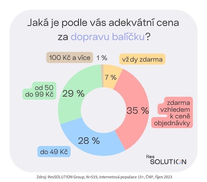 Co se týče ceny za dopravu balíčku, 7 % respondentů aktivních na internetu je toho názoru, že by měla být vždy zdarma. Podle více než třetiny by měla být zdarma od určité ceny objednávky a 28 % míní, že adekvátní cena je do 49 Kč. Cenu mezi 50 a 99 Kč považuje za odpovídající 29 % a pouze 1 % míní, že adekvátní cena dopravy je nad 100 Kč.