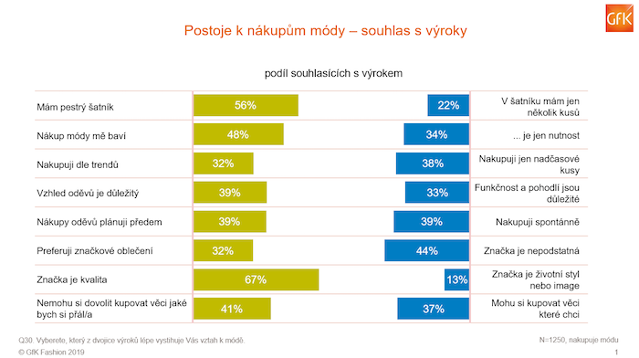 „Jen asi třetina dotázaných preferuje značkové oblečení. Potvrzuje se časté tvrzení, že Češi značky zas tak moc neprožívají – 45 procent dotázaných totiž tvrdí, že značka oblečení není příliš nebo vůbec důležitá,“ říká Martina Drtinová, vedoucí projektu v GfK.
