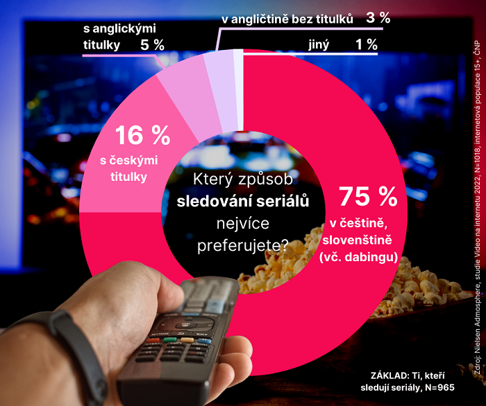 Tři čtvrtiny internetových uživatelů stále nejraději koukají na seriály v češtině, případně slovenštině (tedy i dabované), což je stále drtivá většina. Popularita seriálů v českém znění navíc významně stoupá s věkem: v nejmladší skupině respondentů (15–24 let) je preferuje „jen“ 42 % dotázaných, z respondentů ve středním produktivním věku (35–44 let) už 77 % a z dotázaných nad 55 let dokonce 90 %. Data vycházejí z aktuální volně prodejné studie Nielsen Admosphere Video na internetu 2022, která už dnes zachycuje více než 10letý trend vývoje sledování online videoobsahu v Česku.